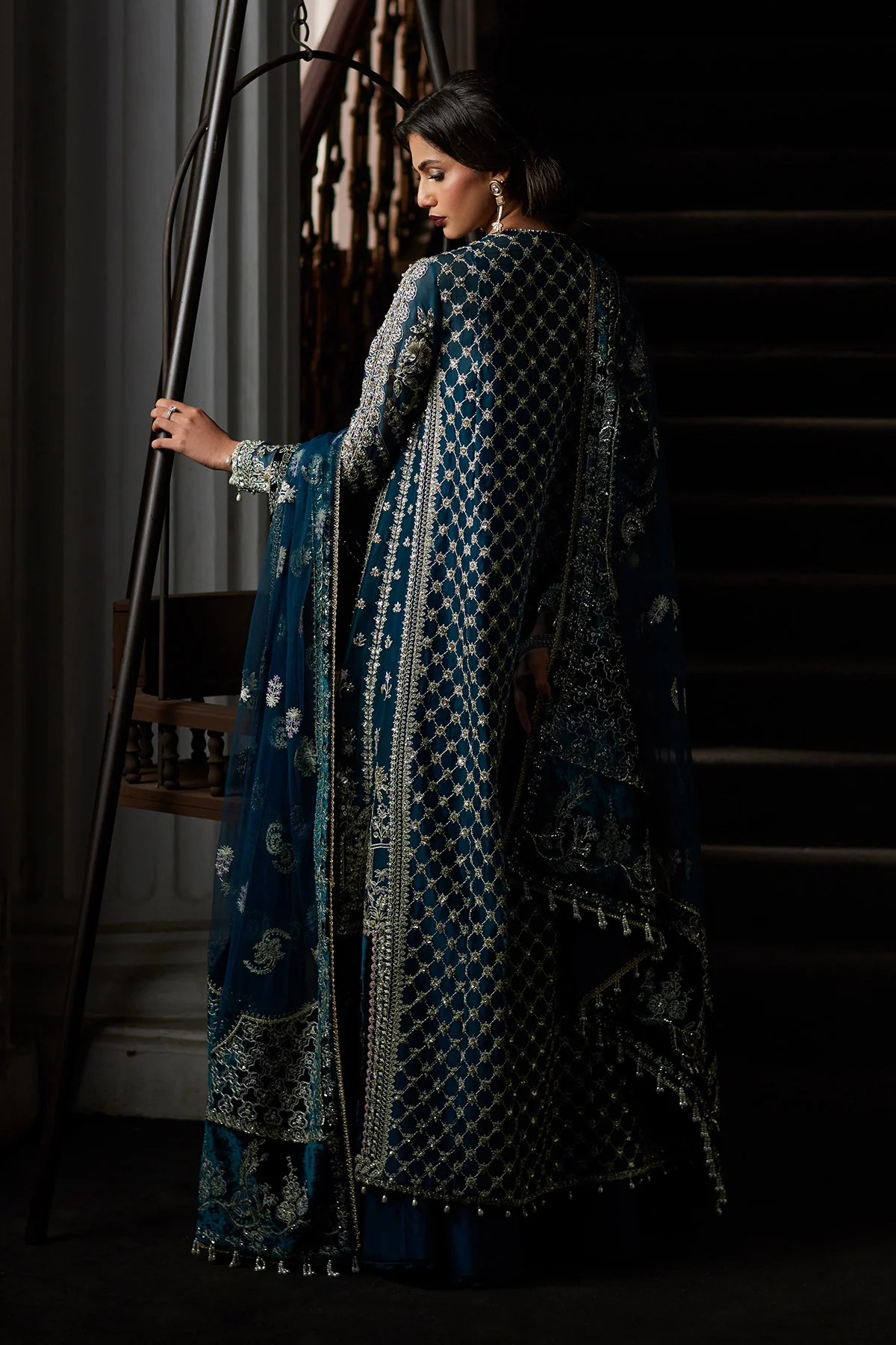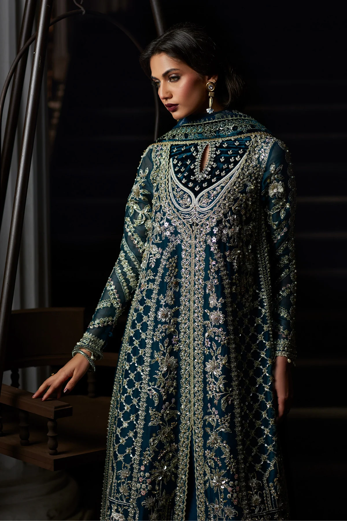 Exquisite deep teal blue front-open gown featuring intricate embroidery and elegant handwork, enhanced by luxurious velvet borders. Paired with shara pants, it comes with a beautiful net dupatta adorned with velvet borders and a stylish palu, making it a perfect choice for any special occasion.