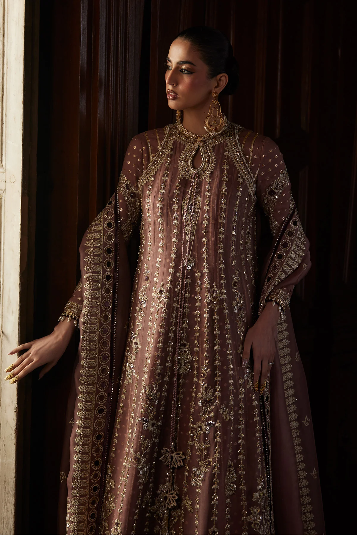 Introducing a stunning Kaalidar in a rich rosewood color, beautifully adorned with intricate handwork that showcases exquisite craftsmanship. This elegant ensemble is paired with a luxurious zaari silk pishwas, adding a touch of opulence to your look. Completing the outfit are graceful sharara pants, offering both comfort and style. The ensemble is beautifully complemented with a finely embroidered dupatta, enhancing its overall charm and sophistication. Perfect for special occasions, this outfit embodies elegance and tradition.